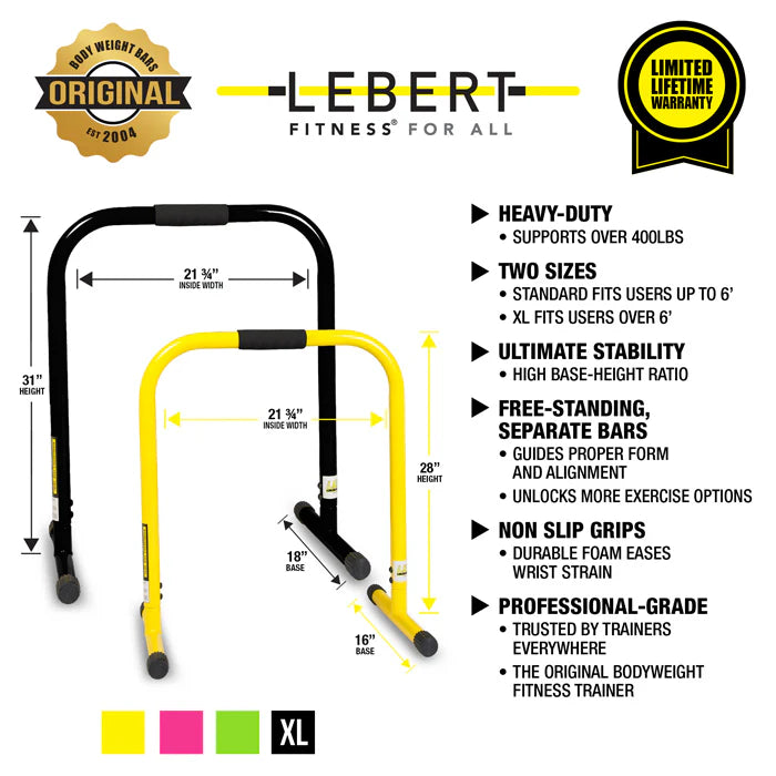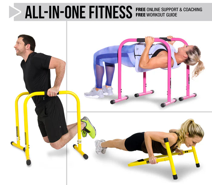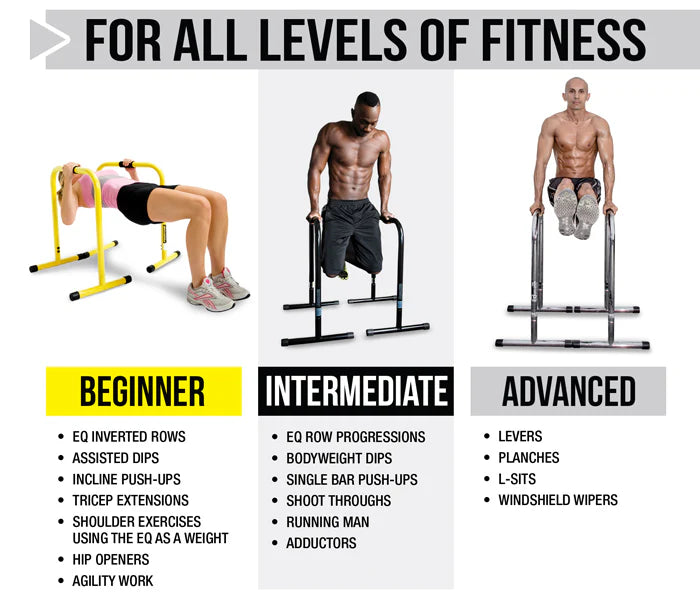 - Over 100 body-weight strength exercises for the beginner to the advanced Full Body Workout - This high-quality functional fitness dip stand station with stabilizing challenger bars is perfect for full body bodyweight resistance exercises such as dips, push and pull ups, L-sits, knee and leg raises, stretches and more.